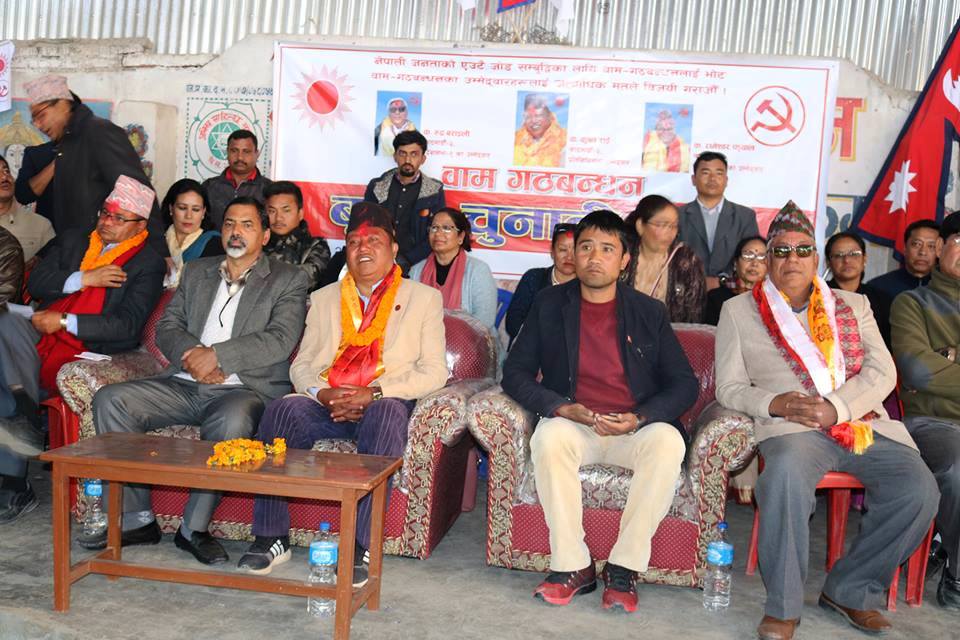 त्यस्तै काठमाडौं क्षेत्र नं। ३ अन्र्तगत प्रदेश १ का साझा उम्मेद्वार रुद्र बराइलले कम्युनिष्टहरुको गठबन्धनलाई हात्तिको संज्ञ दिदैँ यो एकताको शक्तिलाई कसैले छेक्न र रोक्न नसकिने बताए । उनले आफ्नो पक्षमा जनताको माया र सदभाव बढ्दै गएको र आफ्नो जितमा कुनै शंक नरहेको बताए । बराईली नेकपा माओवादी केन्द्रका केन्द्रिय सदस्य समेत हुन् । प्रदेश २ मा पनि एमाले पूर्व सांसद समेत रहेको रामेश्वर फुयालको उम्मेद्वार रहेको छ । सो कार्यक्रममा फुयाँलले आफुले यस क्षेत्रको जनताको प्रतिनिधि भएर थुप्रै विकास निर्माणका काम सम्पन्न गरिसकेको बताउँदै पुन यस पटक जनताकै आग्रहमा निर्वाचनमा होमिएको बताए । नेपाली काँग्रेसले गरिवी निवारण मन्त्रालयबाट २ लाख पैसा ल्याएर जोरपाटी पिपलबस्तीका जनतालाई बढ्न लागेको खबर बाहिर आएको उल्लेख गर्दै खबरदारी समेत गरेका छन् । जनताको पैसा मनोमानी ढंगाले वितरण गर्ने, जनताको मतलाई पैसामा मोलमोलाई प्रवित्तिलाई नियान्त्रण गर्न वाम गठबन्धन सधै निगरानीमा रहने बताए । उनले आफ्नो कामको मूल्यांकन गरेर जनताले विश्वास गर्ने बताए ।