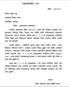 ‘रातारात छापामार शैलीमा कक्षा ११ र १२ को पाठ्यक्रमबाट प्रायोगिक गणित विषय नराखी विद्यालय शिक्षाको पाठ्यक्रम पारित गरेकोमा गम्भीर आपत्ति प्रकट गर्न चाहन्छौँ’, ध्यानाकर्षण पत्रमा भनिएको छ ‘यस विषयवस्तुमाथि नजरअन्दाज गरिएमा हामी जस्तोसुकै आन्दोलन गर्न पनि बाध्य हुनेछौँ ।’